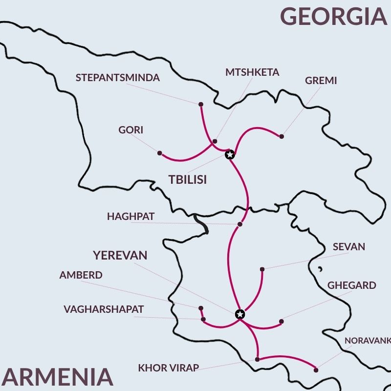 Visitare contemporaneamente l’Armenia e la Georgia in unico itinerario permette di combinare una molteplicità di aspetti che raramente si trovano in altre zone del mondo. È possibile viaggiare a cavallo delle due nazioni percependo la spiritualità cristiana, che ha reso questi paesi i primi ad adottare il cristianesimo come religione di stato, difendendolo all’interno di un’area dominata nei secoli dall’Islam e mantenendo la propria identità. Le chiese e i monasteri, con le loro peculiari caratteristiche che li distinguono, sono una eredità culturale immensa. Entrambi i paesi beneficiano, inoltre, della loro posizione all’interno della regione del Caucaso, con la maestosità delle montagne che superano i 5.000 metri e della natura ancora incontaminata, che ne fanno un vero e proprio paradiso per gli amanti del trekking, per le persone interessate agli sport invernali o, semplicemente, per gli appassionati della montagna. Infine, la ricca e variegata cucina tradizionale dei due paesi, unita alla tradizione vinicola più antica e alla incomparabile e genuina ospitalità regaleranno un viaggio davvero unico.