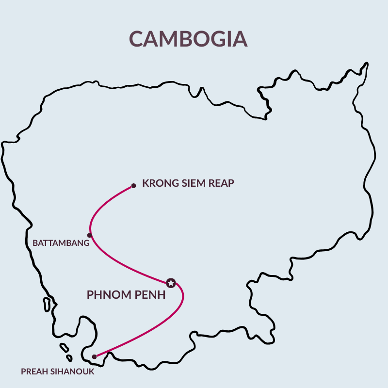 All’interno del Sud-est asiatico, la Cambogia è l’erede dell’antico e potente impero Khmer. I templi di Angkor, che per dimensioni e vastità non hanno uguali nel continente, infatti, sono dei capolavori storici ed architettonici che permettono di immaginare quale fosse stata la grandezza dei Khmer. La vita dei cambogiani è soprattutto rurale, grazie al fiume Mekong e al grande lago Tonle Sap oppure alle montagne del nord, ed è una vita semplice e rispettosa. Nonostante il genocidio perpetrato da Pol Pot meno di 50 anni fa, il popolo cambogiano, composto da diverse etnie, è sempre pronto ad accogliere il visitatore con grande disponibilità e con il sorriso sulle labbra. Questa semplicità si ritrova anche nella cucina tradizionale che, sebbene sia molto simile a quella del vicino Vietnam, mantiene la sua peculiarità fatta di ingredienti semplici. Infine, il paese presenta alcune delle spiagge più belle ed incontaminate del sud-est asiatico, non ancora colpite al turismo di massa e ideali per rilassarsi al termine del viaggio.