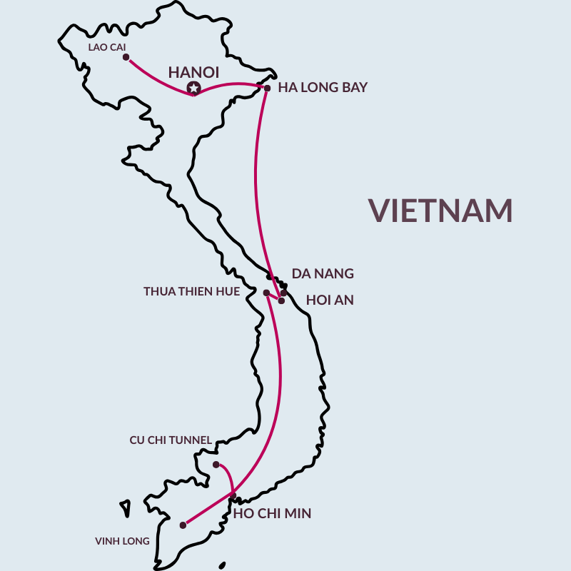 Il viaggio parte dal sud con Ho Chi Minh City, includendo un’immersione nel Delta del Mekong tra villaggi e canali fluviali. Si risale lungo la costa centrale alla scoperta di Hue, antica capitale imperiale, e Hoi An, città storica famosa per i suoi vicoli e le lanterne. A nord si raggiungono Hanoi e la suggestiva Baia di Ha Long, con crociera tra le isolette calcaree, e infine si esplorano zone rurali come le risaie di Mai Châu e Pu Luong, tra paesaggi verdi e villaggi etnici.