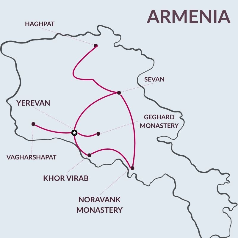 Il tour parte da Yerevan, con la visita della città e dei suoi principali monumenti. Si prosegue verso il tempio di Garni e il monastero di Geghard, poi verso il lago Sevan e i suoi monasteri affacciati sull’acqua. Il viaggio continua fino a Khor Virap, con vista sul Monte Ararat, prima del rientro a Yerevan.