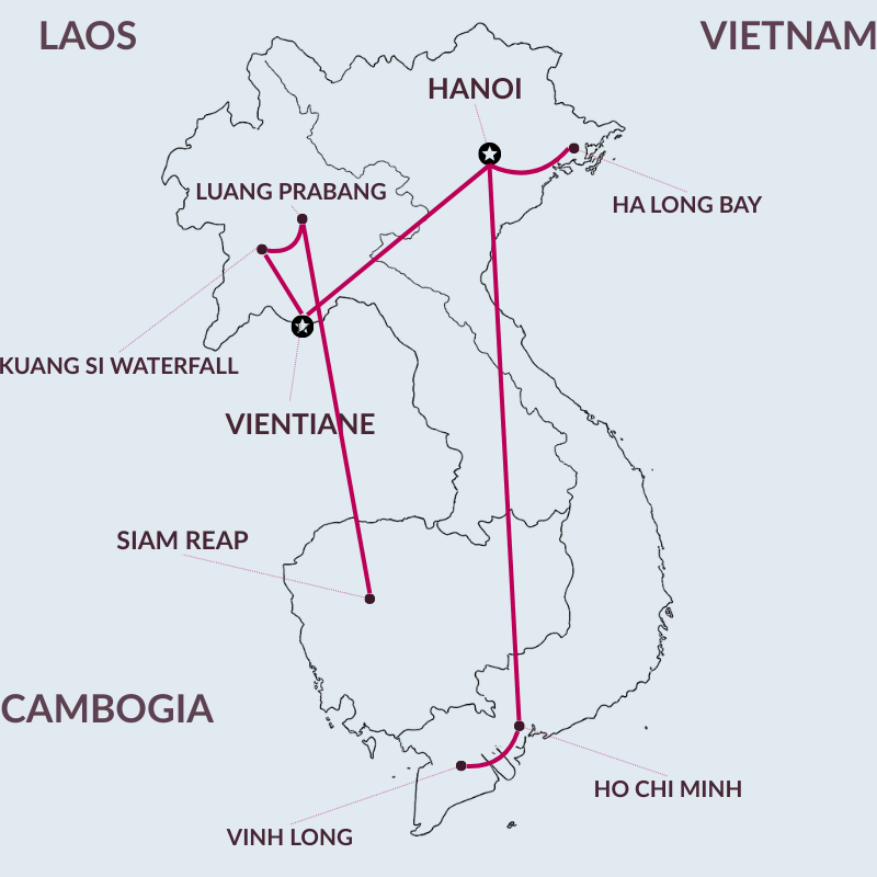 Un itinerario completo nel Sud-est asiatico permette di visitare tre paesi vicini ma dalle proprie caratteristiche ben distinte dagli altri. Il Vietnam, il Laos e la Cambogia hanno una ricca storia, fatta di avvenimenti importanti che hanno segnato la cultura e le tradizioni dei paesi, con una profondità spirituale religiosa e un patrimonio culturale fatto di edifici coloniali, templi antichi e siti archeologici meravigliosi. La natura lussureggiante offre montagne, cascate, foreste e campagne dagli scenari , il culmine dei quali è il fiume Mekong che attraversa tutti e tre i territori, con i suoi paesaggi da cartolina. Le popolazioni locali si distinguono per la grande ospitalità, l’accoglienza calorosa e il sorriso sulle labbra. Questa ospitalità e questo calore verso il visitatore si manifesta anche nelle singole cucine tradizionali che, grazie alla grande diversità delle etnie presenti sul territorio, e all’utilizzo di ingredienti semplici ma ben equilibrati, rendono i piatti locali tra i più attraenti e gustosi del mondo